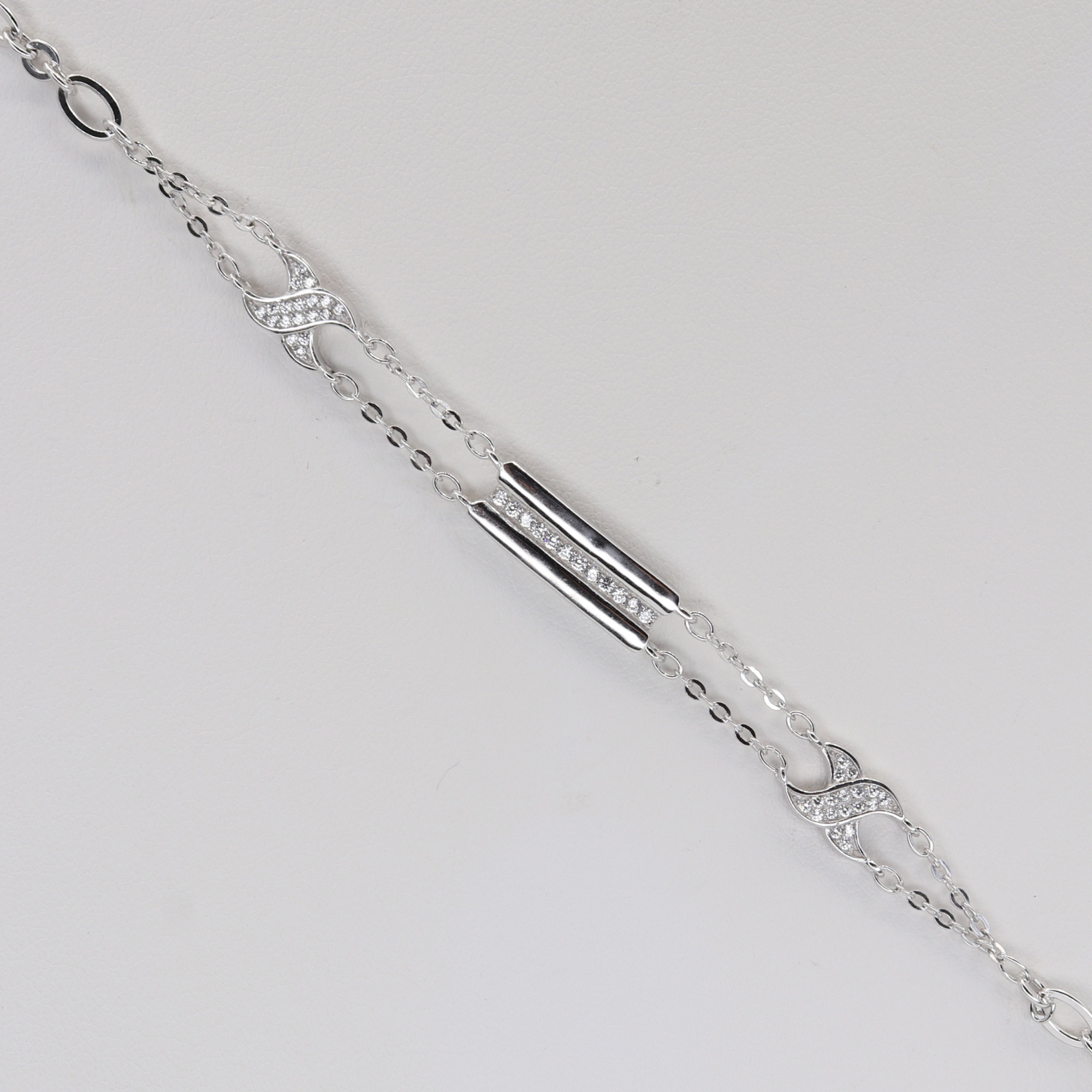 B1836Stříbrný náramek zdobený zirkony ve stylu nekonečna.